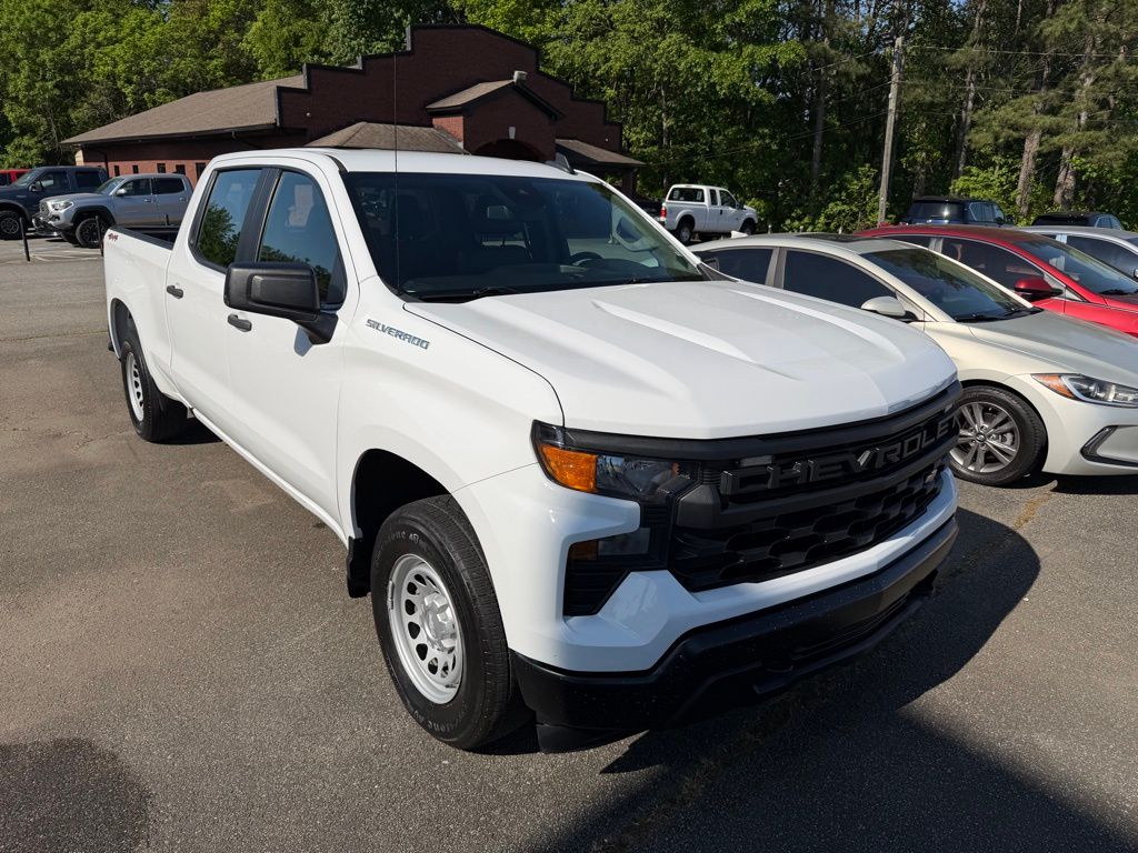 Summit White 2023 Chevrolet Silverado 1500 WT EcoTec3 5.3L V8 10-Speed Automatic 4D Crew Cab Preferred Equipment Group 1WT (3.5" Monochromatic Display Driver Info Center, Black (Semi-Gloss) Front Bumper, Black (Semi-Gloss) Rear Bumper, Black Manual Outside Mirrors, Bluetooth® For Phone, Electrical Steering Column Lock, Front Frame-Mounted Black Recovery Hooks, HD Rear Vision Camera, Inside Rear-View Mirror w/Tilt, Locking Tailgate, Manual Tailgate Function w/No EZ Lift, Manual Tilt Wheel Steering Column, Power Front Windows w/Driver Express Up/Down, Power Front Windows w/Passenger Express Down, Power Rear Windows w/Express Down, Rear 60/40 Folding Bench Seat (Folds Up), Remote Keyless Entry, Rubberized-Vinyl Floor Covering, Solar Absorbing Tinted Glass, and Standard Tailgate), Standard Suspension Package, Trailering Package (Hitch Guidance), 120-Volt Bed Mounted Power Outlet, 120-Volt Instrument Panel Power Outlet, 170 Amp Alternator, 220 Amp Alternator, 3 Years of Remote Access, 4-Wheel Disc Brakes, 40/20/40 Front Split-Bench Seat, 6 Speakers, 6-Speaker Audio System, ABS brakes, Air Conditioning, AM/FM radio, Apple CarPlay/Android Auto, Auto High-beam Headlights, Auto-Locking Rear Differential, Automatic Emergency Braking, Auxiliary External Transmission Oil Cooler, Brake assist, Chevrolet Connected Access Capable, Compass, Delay-off headlights, Driver door bin, Dual front impact airbags, Dual front side impact airbags, Dual Rear USB Ports (Charge Only), Electronic Cruise Control, Electronic Stability Control, External Engine Oil Cooler, EZ Lift Power Lock & Release Tailgate, Following Distance Indicator, Forward Collision Alert, Front anti-roll bar, Front Center Armrest w/Storage, Front Pedestrian Braking, Front reading lights, Front wheel independent suspension, Fully automatic headlights, Heated Power-Adjustable Outside Mirrors, Illuminated entry, Integrated Trailer Brake Controller, IntelliBeam Automatic High Beam On/Off, Lane Keep Assist w/Lane Departure Warning, Low tire pressure warning, Manual Tilt/Telescoping Steering Column (DISC), Not Equipped w/Rear USB Ports, Not Equipped w/Steering Column Lock, Occupant sensing airbag, OnStar & Chevrolet Connected Services Capable, Outside temperature display, Overhead airbag, Overhead console, Panic alarm, Passenger door bin, Passenger vanity mirror, Power steering, Power windows, Premium audio system: Chevrolet Infotainment 3, Radio data system, Radio: Chevrolet Infotainment 3 System, Rear reading lights, Rear step bumper, Remote keyless entry, SiriusXM Radio, Speed-sensing steering, Split folding rear seat, Tachometer, Tilt steering wheel, Traction control, Trip computer, Variably intermittent wipers, Vinyl Seat Trim, Voltmeter, Wheels: 17" x 8" Ultra Silver Painted Steel, Wi-Fi Hot Spot Capable, and Wireless Phone Projection.