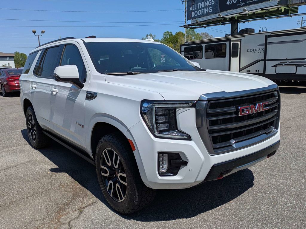 Summit White 2021 GMC Yukon AT4 EcoTec3 5.3L V8 10-Speed Automatic with Overdrive 4D Sport Utility AT4 Premium Plus Package (Dual-Pane Panoramic Power Sunroof and Power-Retractable Assist Steps), License Plate Front Mounting Package, Max Trailering Package (Extra Capacity Cooling System), Preferred Equipment Group 4SB (12-Way Power Seat Adjusters, 2 Presets For Outside Rearview Mirrors, 3rd Row 60/40 Power-Folding Split-Bench Seat, Black Roof-Mounted Luggage Rack Side Rails, Bose 9-Speaker Stereo Audio System Feature, Bright Front & Rear Door Sill Plates, Front High-Approach Angle Fascia, Hands-Free Power Programmable Rear Liftgate, Heated & Ventilated Driver & Front Passenger Seats, Heated 2nd Row Outboard Position Seats, Heated Automatic Steering Wheel, Heated Driver & Front Passenger Seats, Heavy-Duty Air Filter, Hill Descent Control, Inside Rear-View Auto-Dimming Mirror, Outside Heated Power-Adjustable Mirrors, Power Release 2nd Row 60/40 Split-Folding Bench Seat, Power Tilt & Telescopic Steering Column, Red Horizontal-Mounted Recovery Hooks, Safety Alert Seat, and Universal Home Remote), Premium Capability Package w/Active Response 4WD (Air Ride Adaptive Suspension and Electronic Limited Slip Differential (eLSD)), Rear Media & Nav Package (HD Radio, Radio: AM/FM/SiriusXM w/Navigation, Rear Seat Media System, and SiriusXM w/360L), Technology Package (15" Diagonal Multi-Color Head-Up Display, HD Surround Vision, and Rear Pedestrian Alert), 3.23 Rear Axle Ratio, 3rd row seats: split-bench, 4-Wheel Disc Brakes, 9 Speakers, ABS brakes, Adaptive suspension, Air Conditioning, All-Weather Floor Mats, Alloy wheels, AM/FM radio: SiriusXM with 360L, Apple CarPlay/Android Auto, Auto High-beam Headlights, Auto-dimming door mirrors, Auto-dimming Rear-View mirror, Auto-leveling suspension, Automatic Emergency Braking, Automatic temperature control, Brake assist, Bumpers: body-color, Compass, Delay-off headlights, Driver door bin, Driver vanity mirror, Dual front impact airbags, Dual front side impact airbags, Electronic Stability Control, Emergency communication system: OnStar and GMC connected services capable, Following Distance Indicator, Forward Collision Alert, Four wheel independent suspension, Front & Rear Park Assist, Front anti-roll bar, Front Bucket Seats, Front Center Armrest, Front dual zone A/C, Front fog lights, Front Pedestrian Braking, Front reading lights, Fully automatic headlights, Garage door transmitter, Heated door mirrors, Heated front seats, Heated rear seats, Heated steering wheel, Hitch Guidance w/Hitch View, Illuminated entry, In-Vehicle Trailering App, Integrated Trailer Brake Controller, IntelliBeam Automatic High Beam On/Off, Lane Change Alert w/Side Blind Zone Alert, Lane Keep Assist w/Lane Departure Warning, Leather steering wheel, Low tire pressure warning, Magnetic Ride Control Suspension, Memory seat, Occupant sensing airbag, Outside temperature display, Overhead airbag, Overhead console, Panic alarm, Passenger door bin, Passenger vanity mirror, Perforated Leather Seating Surfaces, Power door mirrors, Power driver seat, Power Liftgate, Power passenger seat, Power Release 2nd Row Bucket Seats, Power steering, Power windows, Radio: AM/FM/SiriusXM, Rain sensing wipers, Rear air conditioning, Rear anti-roll bar, Rear Cross Traffic Alert, Rear reading lights, Rear seat center armrest, Rear window defroster, Rear window wiper, Remote keyless entry, Roof rack: rails only, Security system, Speed control, Speed-sensing steering, Split folding rear seat, Spoiler, Steering wheel memory, Steering wheel mounted audio controls, Tachometer, Telescoping steering wheel, Tilt steering wheel, Traction control, Trailer Side Blind Zone Alert, Trip computer, Turn signal indicator mirrors, Variably intermittent wipers, Ventilated front seats, Voltmeter, and Wheels: 20" x 9" 6-Spoke Machined Aluminum.