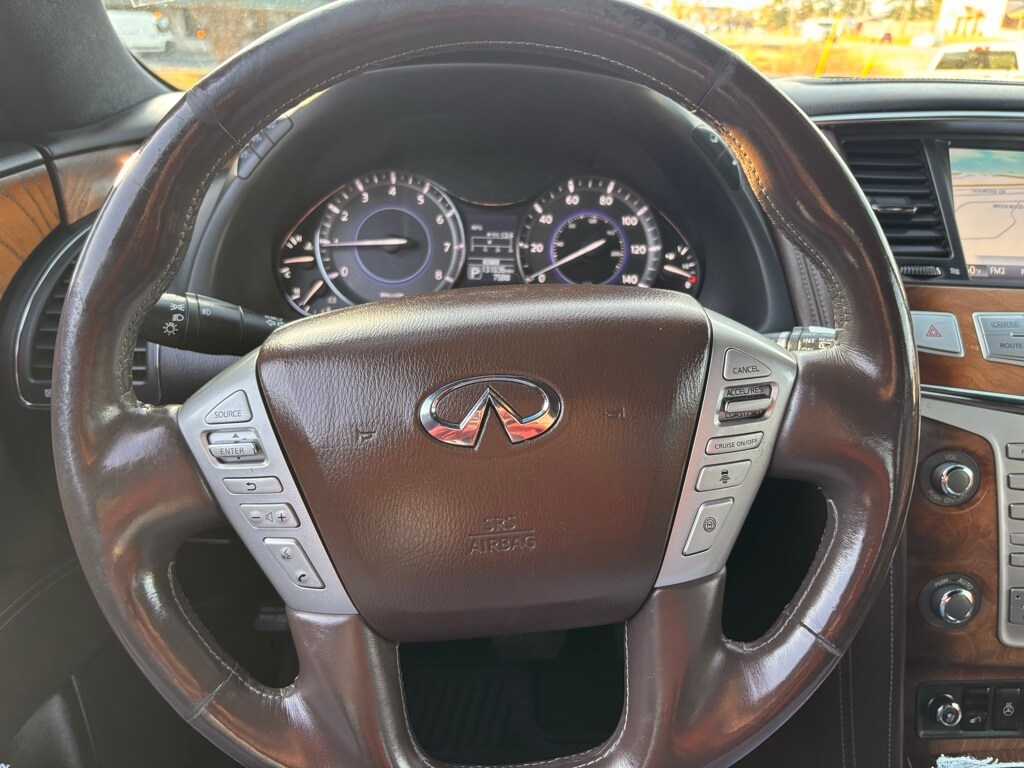Hermosa Blue 2016 INFINITI QX80 Limited 5.6L V8 7-Speed Automatic 4D Sport Utility Limited Edition Accessory Package (Roof Rail Crossbars), 15 Speakers, 2.94 Axle Ratio, 3rd row seats: split-bench, 4-Wheel Disc Brakes, A/V remote, ABS brakes, Activation Disclaimer, Air Conditioning, Alloy wheels, AM/FM radio: SiriusXM, Anti-whiplash front head restraints, Auto High-beam Headlights, Auto tilt-away steering wheel, Auto-dimming door mirrors, Auto-dimming Rear-View mirror, Auto-leveling suspension, Automatic temperature control, Bose Premium Sound System, Brake assist, Bumpers: body-color, CD player, Chrome wheels, Delay-off headlights, Driver door bin, Driver vanity mirror, Dual front impact airbags, Dual front side impact airbags, Electronic Stability Control, Emergency communication system: INFINITI Connection, Four wheel independent suspension, Front anti-roll bar, Front Bucket Seats, Front Center Armrest, Front dual zone A/C, Front fog lights, Front reading lights, Fully automatic headlights, Garage door transmitter: HomeLink, Genuine wood console insert, Genuine wood dashboard insert, Genuine wood door panel insert, Headlight cleaning, Headphones, Heated door mirrors, Heated Front Bucket Seats, Heated front seats, Heated rear seats, Heated steering wheel, Illuminated entry, Illuminated running boards, Lane Departure Warning System, Leather Shift Knob, Leather steering wheel, Literature Kit, Low tire pressure warning, Memory seat, Navigation System, Occupant sensing airbag, Outside temperature display, Overhead airbag, Overhead console, Panic alarm, Passenger door bin, Passenger vanity mirror, Power door mirrors, Power driver seat, Power Liftgate, Power moonroof, Power passenger seat, Power steering, Power windows, Radio data system, Rain sensing wipers, Rear air conditioning, Rear anti-roll bar, Rear audio controls, Rear reading lights, Rear seat center armrest, Rear window defroster, Rear window wiper, Reclining 3rd row seat, Remote keyless entry, Roof rack: rails only, Security system, Semi-Aniline Leather Seating w/Contrast Stitching, Speed control, Speed-sensing steering, Split folding rear seat, Spoiler, Steering wheel memory, Steering wheel mounted audio controls, Tachometer, Telescoping steering wheel, Tilt steering wheel, Traction control, Trip computer, Turn signal indicator mirrors, Variably intermittent wipers, Ventilated front seats, Voltmeter, and Wheels: 22" Dark Chrome Finish.