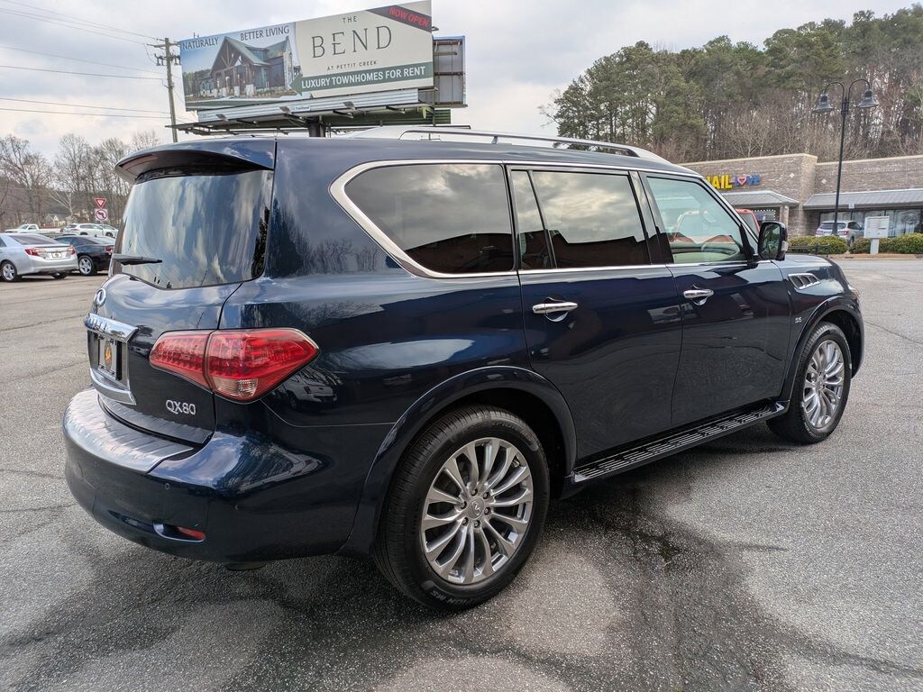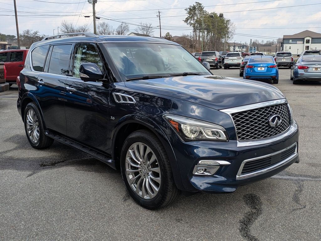 Hermosa Blue 2017 INFINITI QX80 5.6L V8 7-Speed Automatic 4D Sport Utility 22" Tire & Wheel Package (Wheels: 22" x 8.0" 14-Spoke Forged Aluminum-Alloy), Driver Assistance Package (Backup Collision Intervention (BCI), Blind Spot Intervention (BSI), Blind Spot Warning, Intelligent Cruise Control (Full-Speed Range), and Lane Departure Warning System), Theater Package (120V Power Outlet, Dual 7" Color Monitors, Heated 2nd-Row Seats, and Wireless Headphones (2)), 13 Speakers, 2.94 Axle Ratio, 3rd row seats: split-bench, 4-Wheel Disc Brakes, ABS brakes, Air Conditioning, Alloy wheels, AM/FM radio: SiriusXM, Anti-whiplash front head restraints, Auto High-beam Headlights, Auto tilt-away steering wheel, Auto-dimming door mirrors, Auto-dimming Rear-View mirror, Auto-leveling suspension, Automatic temperature control, Bose Premium Sound System, Brake assist, Bumpers: body-color, Carpeted Cargo Mat/Cargo Net & First Aid Kit, CD player, Delay-off headlights, Driver door bin, Driver vanity mirror, Dual front impact airbags, Dual front side impact airbags, Electronic Stability Control, Emergency communication system: INFINITI Connection, Four wheel independent suspension, Front anti-roll bar, Front Bucket Seats, Front Center Armrest, Front dual zone A/C, Front fog lights, Front reading lights, Fully automatic headlights, Garage door transmitter: HomeLink, Genuine wood console insert, Genuine wood dashboard insert, Genuine wood door panel insert, Heated door mirrors, Heated Front Bucket Seats, Heated front seats, Heated steering wheel, Illuminated entry, Leather Shift Knob, Leather steering wheel, Leather-Appointed Seats w/Mocha Burl Trim, Low tire pressure warning, Memory seat, Navigation System, Occupant sensing airbag, Outside temperature display, Overhead airbag, Overhead console, Panic alarm, Passenger door bin, Passenger vanity mirror, Power door mirrors, Power driver seat, Power Liftgate, Power moonroof, Power passenger seat, Power steering, Power windows, Radio data system, Rain sensing wipers, Rear air conditioning, Rear anti-roll bar, Rear audio controls, Rear reading lights, Rear seat center armrest, Rear window defroster, Rear window wiper, Reclining 3rd row seat, Remote keyless entry, Roof rack: rails only, Security system, Speed control, Speed-sensing steering, Split folding rear seat, Spoiler, Steering wheel memory, Steering wheel mounted audio controls, Tachometer, Telescoping steering wheel, Tilt steering wheel, Traction control, Trip computer, Turn signal indicator mirrors, Variably intermittent wipers, Voltmeter, and Wheels: 20" x 8.0" Split 6-Spoke Aluminum-Alloy.