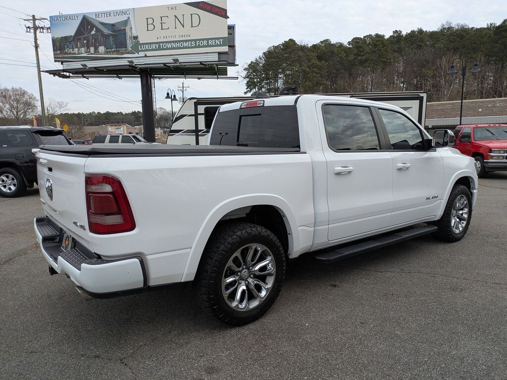 Bright White Clearcoat 2020 Ram 1500 Laramie HEMI 5.7L V8 Multi Displacement VVT 8-Speed Automatic 4D Crew Cab Laramie Level 2 Equipment Group (1-Yr SiriusXM Guardian Trial, 4G LTE Wi-Fi Hot Spot, 5-Year SiriusXM Traffic Service, 5-Year SiriusXM Travel Link Service, 8.4" Touchscreen Display, Apple CarPlay, Disassociated Touchscreen Display, For Details, Visit DriveUconnect.com, GPS Antenna Input, GPS Navigation, HD Radio, Integrated Center Stack Radio, Radio: Uconnect 4C Nav w/8.4" Display, Rear Underseat Compartment Storage, SiriusXM Satellite Radio, SiriusXM Traffic Plus, and SiriusXM Travel Link), Quick Order Package 27H Laramie, Sport Appearance Package (Wheels: 20" x 9" Premium Painted w/Inserts), Trailer Tow Group (Trailer Brake Control), #1 Seat Foam Cushion, 10 Speakers, 3 Rear Seat Head Restraints, 3.21 Rear Axle Ratio, 4 Way Front Headrests, 4-Wheel Disc Brakes, 48V Belt Starter Generator, ABS brakes, Adjustable pedals, Air Conditioning, Alloy wheels, AM/FM radio: SiriusXM, Apple CarPlay/Android Auto, Audio memory, Auto-dimming door mirrors, Auto-dimming Rear-View mirror, Automatic temperature control, Brake assist, Bumpers: chrome, Compass, Delay-off headlights, Driver door bin, Driver Seat Memory, Driver vanity mirror, Dual front impact airbags, Dual front side impact airbags, Electronic Stability Control, Front & Rear Rubber Floor Mats, Front anti-roll bar, Front Center Armrest w/Storage, Front dual zone A/C, Front fog lights, Front reading lights, Front Seat Back Map Pockets, Front wheel independent suspension, Fully automatic headlights, Garage door transmitter, Google Android Auto, Heated door mirrors, Heated Front Seats, Heated front seats, Heated Steering Wheel, Heated steering wheel, Illuminated entry, Leather steering wheel, Leather Trim 40/20/40 Bench Seat, Low tire pressure warning, Memory seat, Occupant sensing airbag, Outside temperature display, Overhead airbag, Overhead console, Panic alarm, ParkSense Front/Rear Park Assist w/Stop (DISC), ParkView Rear Back-Up Camera, Passenger door bin, Passenger vanity mirror, Pedal memory, Power 4-Way Driver Lumbar Adjust, Power 4-Way Passenger Lumbar Adjust, Power 8-Way Driver & Passenger Seats, Power door mirrors, Power driver seat, Power passenger seat, Power steering, Power windows, Radio data system, Radio: Uconnect 4 w/8.4" Display, Rear anti-roll bar, Rear seat center armrest, Rear step bumper, Rear window defroster, Remote keyless entry, Security system, Speed control, Split folding rear seat, Steering wheel mounted audio controls, Tachometer, Telescoping steering wheel, Tilt steering wheel, Traction control, Trip computer, Turn signal indicator mirrors, Variably intermittent wipers, Ventilated Front Seats, Ventilated front seats, Voltmeter, and Wheels: 18" x 8" Aluminum Base PainteD.